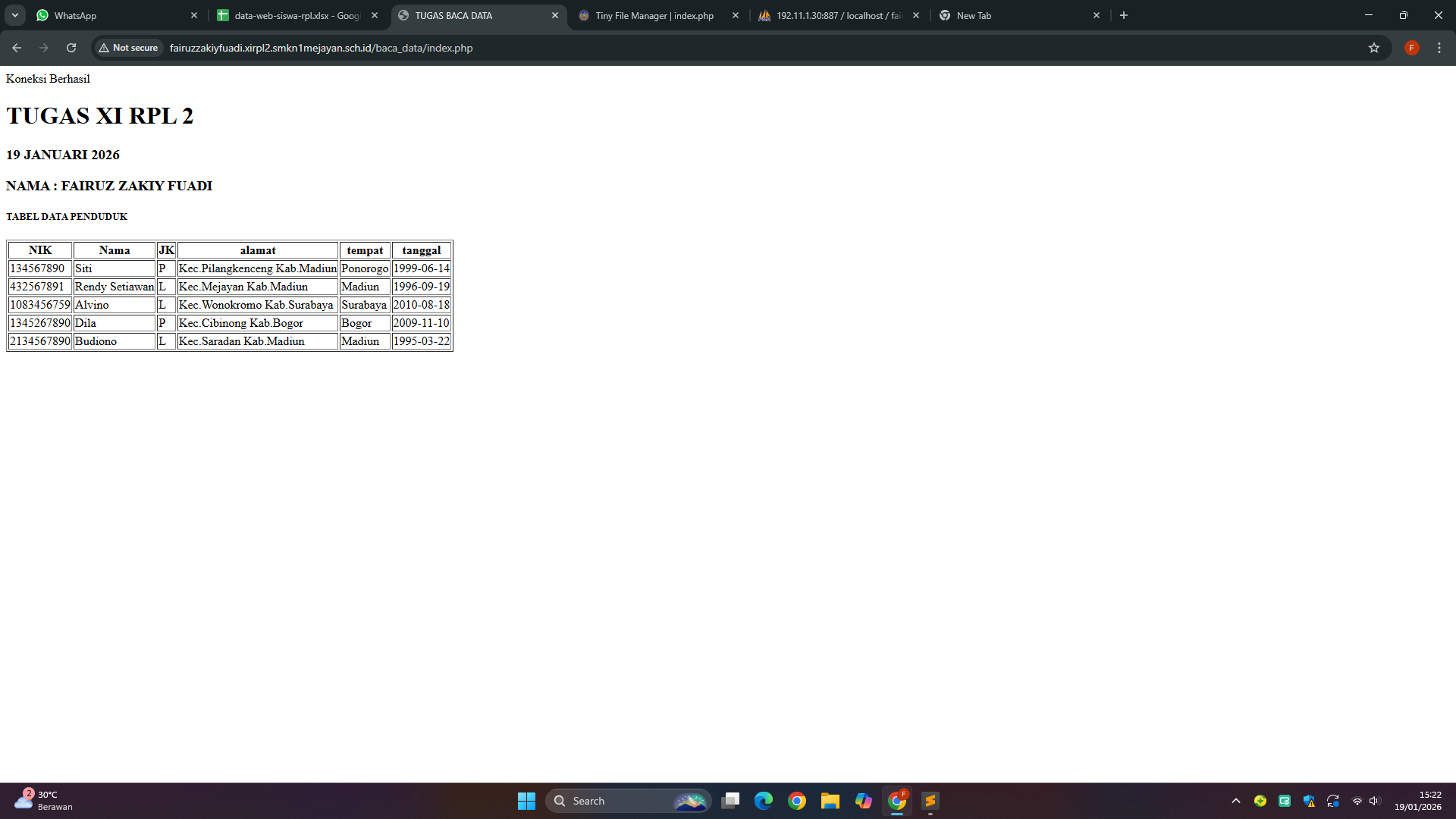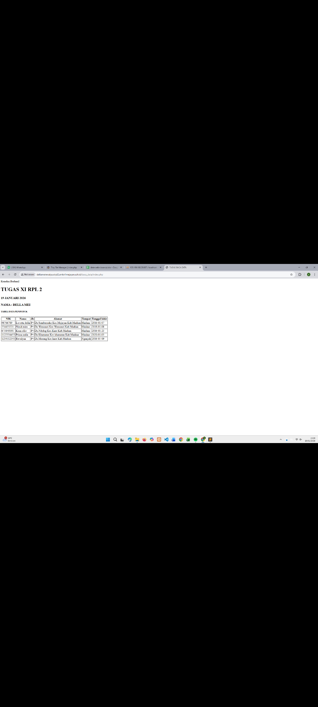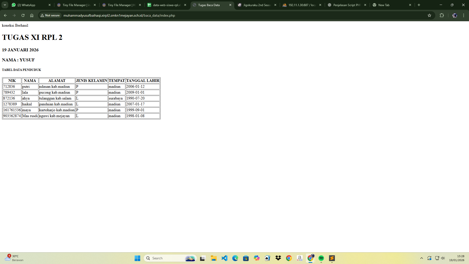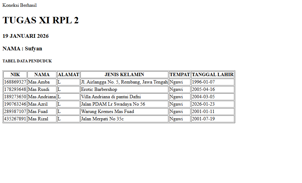| 12 | 4 | Andrian Wicaksana | http://andrianwicaksana.xirpl2.smkn1mejayan.sch.id/Baca_Data/index.php | ![]() |