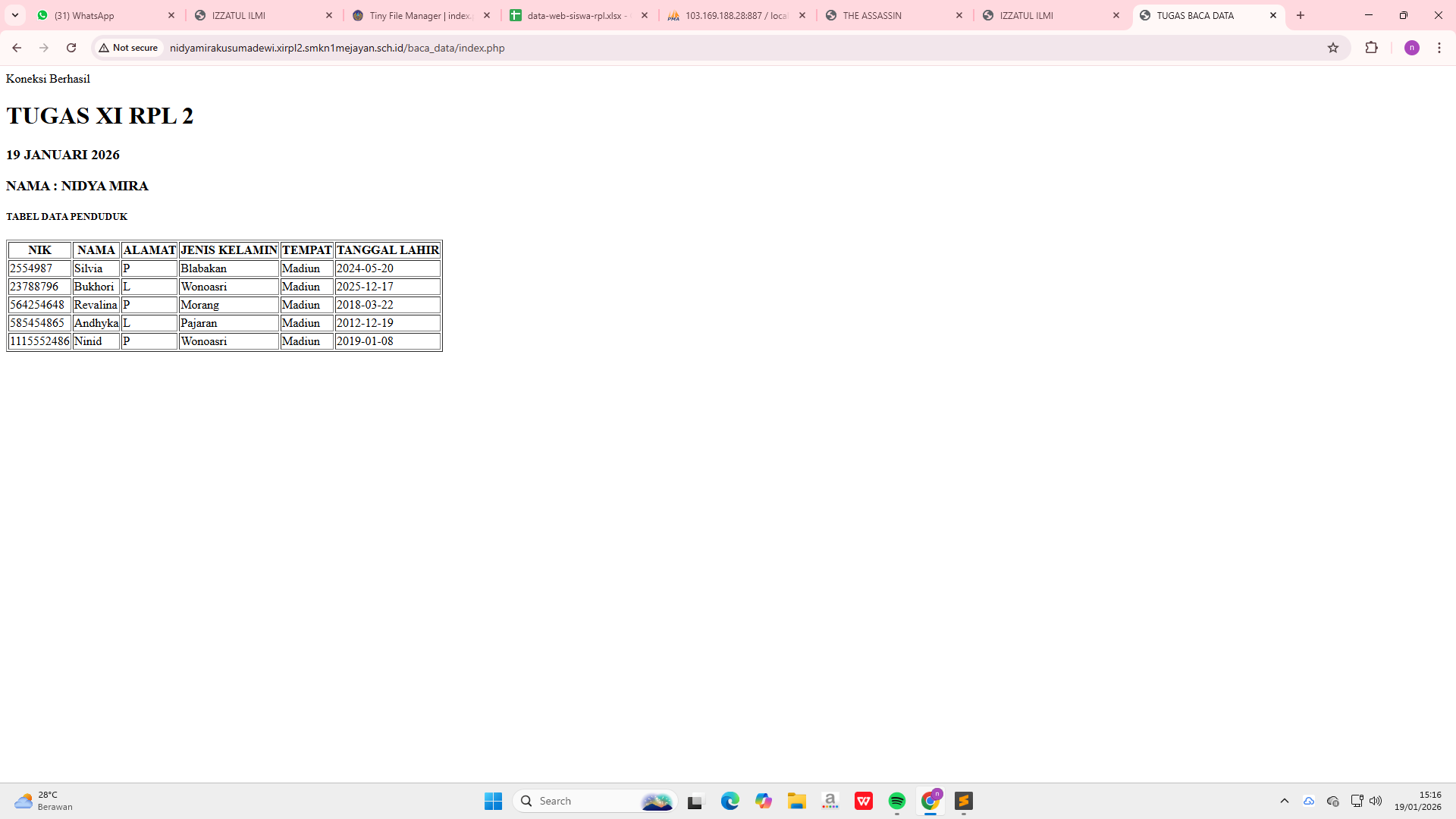 | 5 | 25 | nidya mira kusuma dewi | http://nidyamirakusumadewi.xirpl2.smkn1mejayan.sch.id/baca_data/index.php | ![]() |