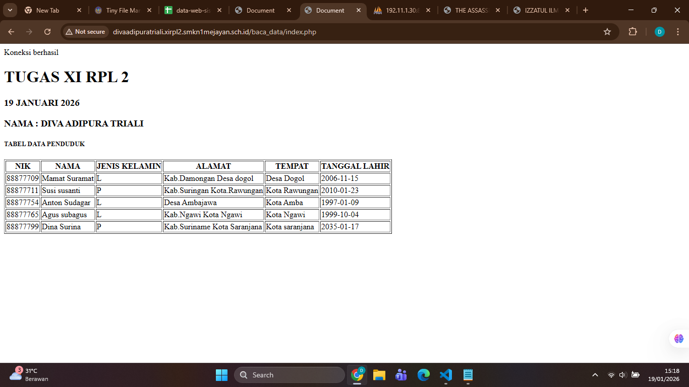 | 19 | 5 | Annisaa Salsabela H. | http://annisaasalsabelahartono.xirpl2.smkn1mejayan.sch.id/baca_data/index.php | ![]() |