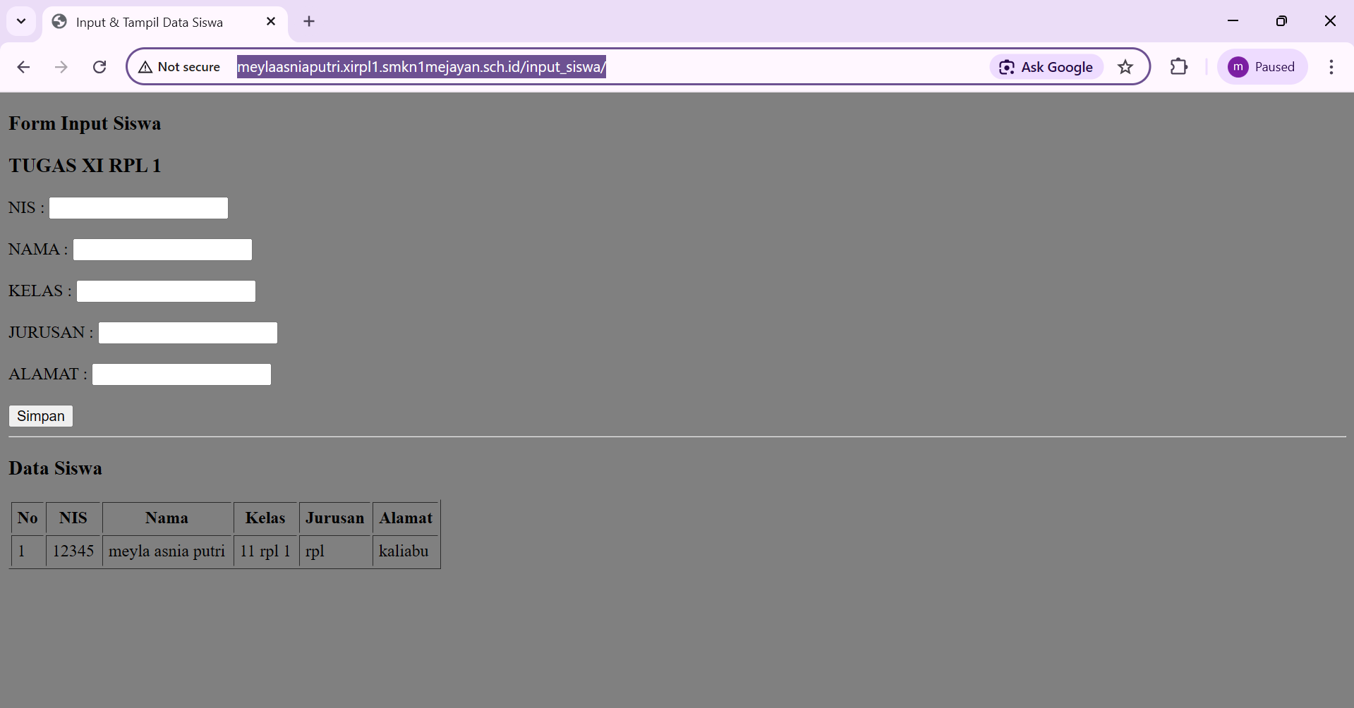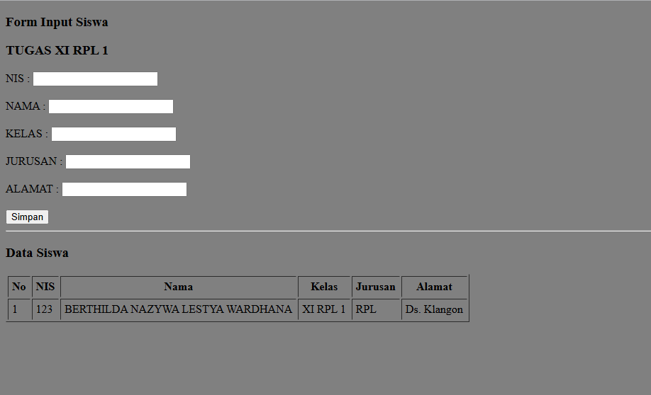 | 4 | 1 | Ahdan Naufal Aziz | http://ahdannaufalazizzaim.xirpl1.smkn1mejayan.sch.id/input_siswa/ | ![]() |