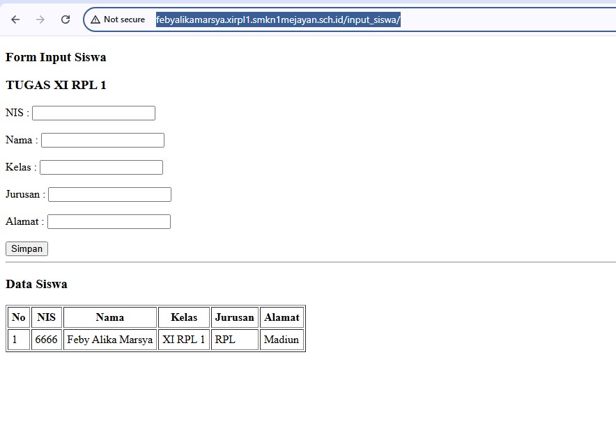 | 1 | 14 | Feby Alika Marsya | http://febyalikamarsya.xirpl1.smkn1mejayan.sch.id/input_siswa/ | ![]() |