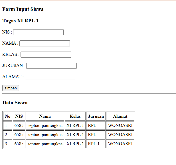 | 3 | 27 | septian pamungkas | septianpamungkas.xirpl1.smkn1mejayan.sch.id/input_siswa/index.php | ![]() |