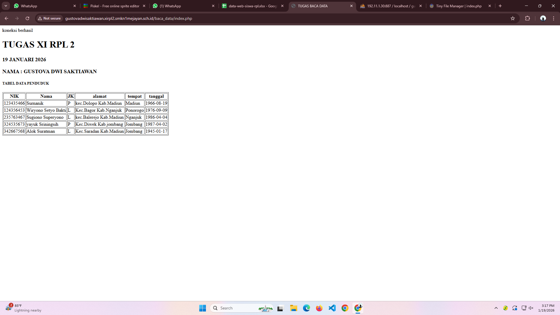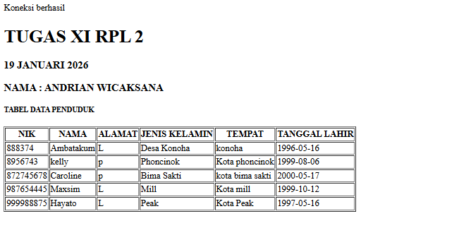 | 12 | 4 | Andrian Wicaksana | http://andrianwicaksana.xirpl2.smkn1mejayan.sch.id/Baca_Data/index.php | ![]() |