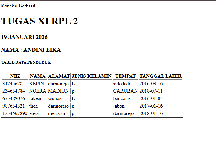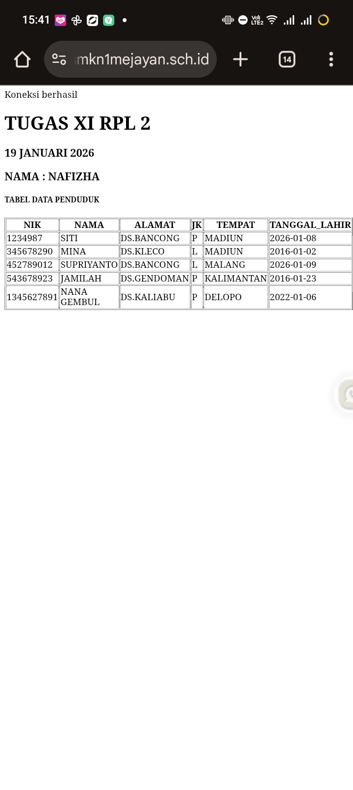 | 14 | 3 | ANDINI EIKA RAHAYU | http://andinieikarahayu.xirpl2.smkn1mejayan.sch.id/baca_data/index.php | ![]() |